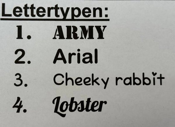 Verkrijgbaar in verschillende kleuren. Naam kan in het wit/zwart, recht/schuin en verschillende lettertypen.