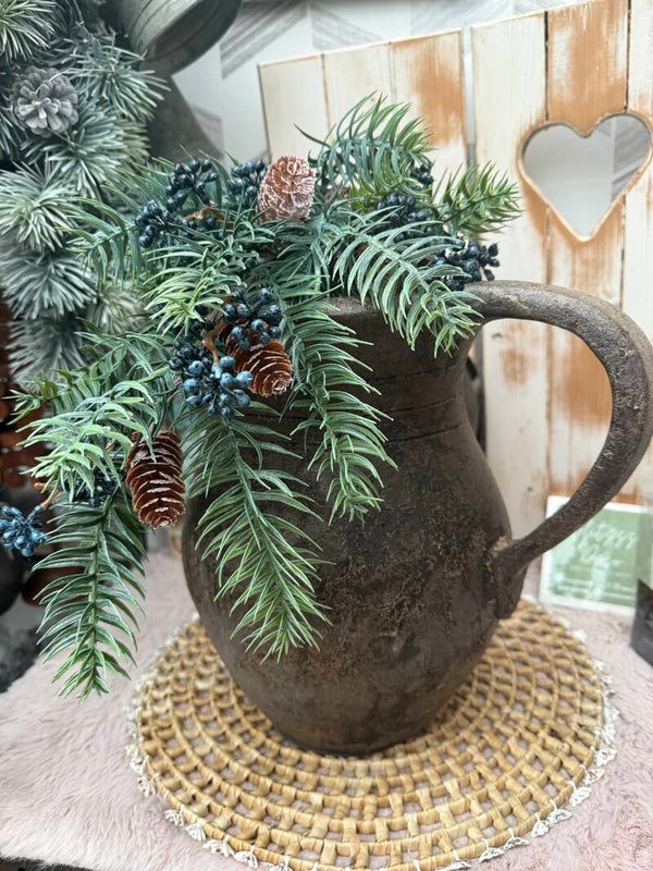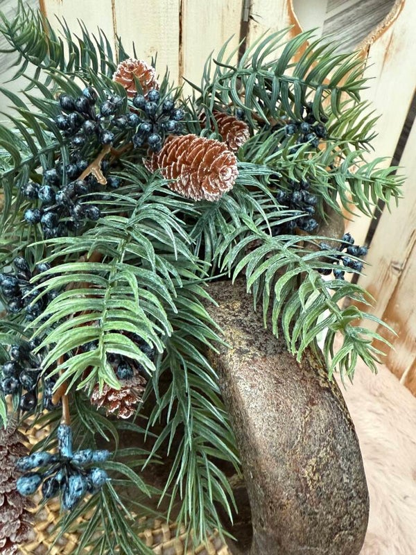 Prachtige kunst toef van dennengroen met blauwe bessen en dennenappel. De toef heeft een lengte van ca 40 cm. Perfect om mee te decoreren voor de winter en of kerst.
